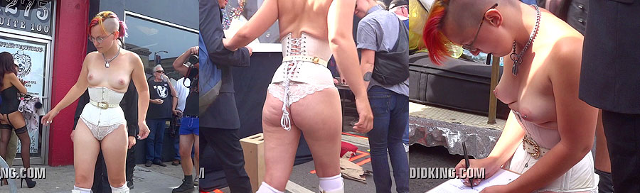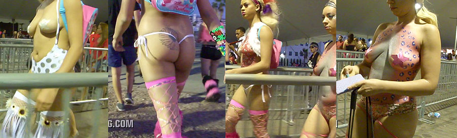 We actually catch this babe on 2 separate days but the second day is when she really shows off. She wears a string thong and body paint to cover her tits, a must see!