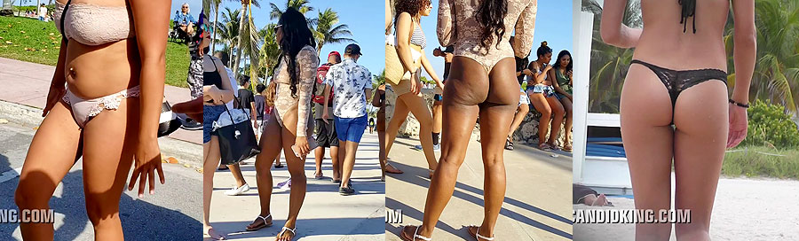 One babe that doesn't mind walking the streets in her tiny thong bikini to show off her sexy tan ass! We follow her around and get good shots of her butt in motion and it's only on CandidKing.com!