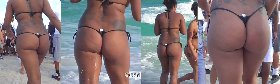 Two sexy friends each wearing tiny thong bikinis! We head to the beach to catch these girls and get some good shots so you can decide which you like best, the big juicy ass or the slim perky butt!